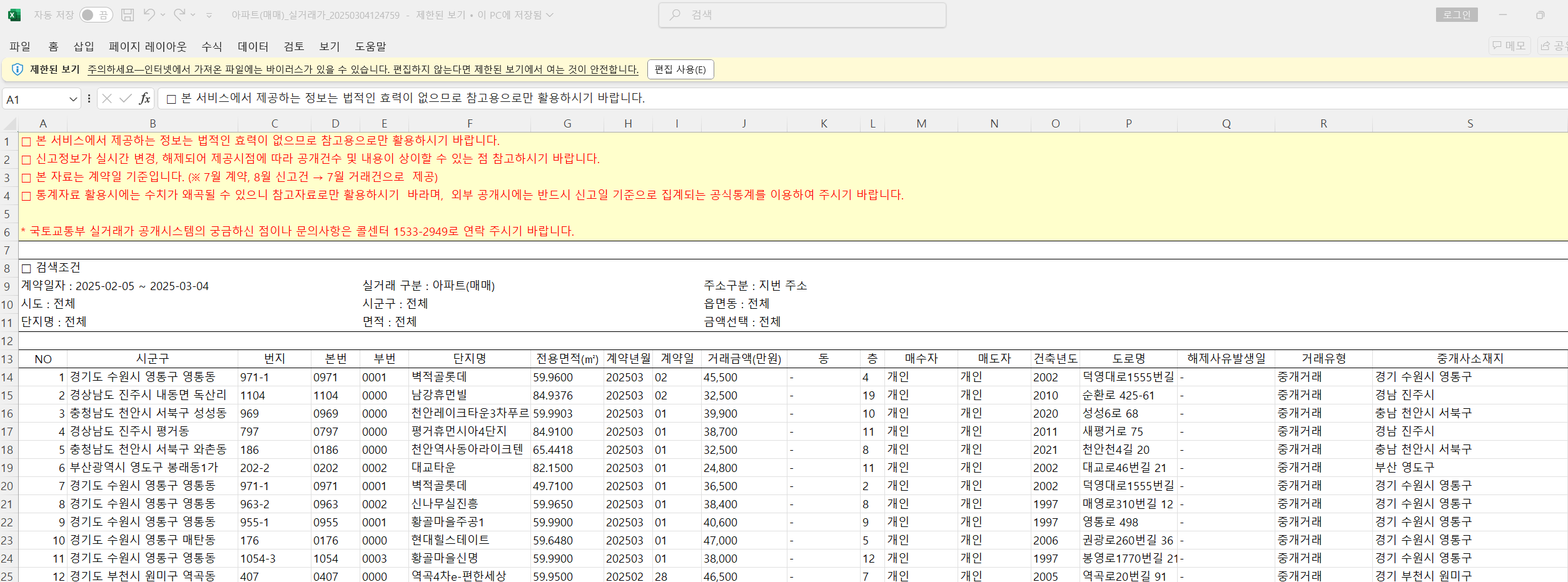 - 엑셀 다운로드: 검색한 데이터를 엑셀 파일로 저장할 수 있습니다.