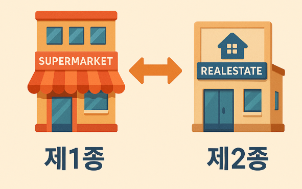 슈퍼마켓(제1종)을 운영하던 사람이 부동산중개업소(제2종)로 전환할 경우, 이제는 복잡한 용도변경 신청 없이 바로 중개사무소 개설등록만 하면 됩니다.