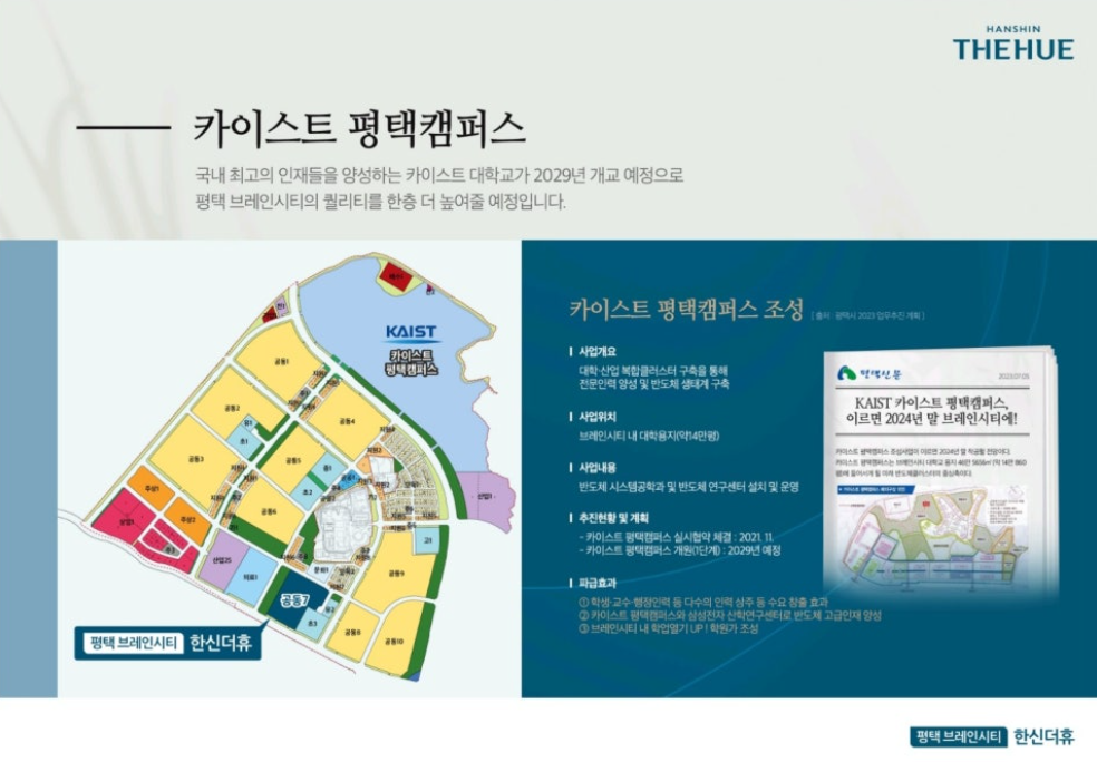 미래 가치 측면에서는 브레인시티가 146만 평 규모의 신도시로 개발되며, 카이스트 평택캠퍼스가 2030년 개교 예정이고, 아주대 의료복합타운이 2030년 개원 예정입니다. 또한, 브레인 시티 내 상업시설, 문화복지시설, 하나로마트, 코스트코