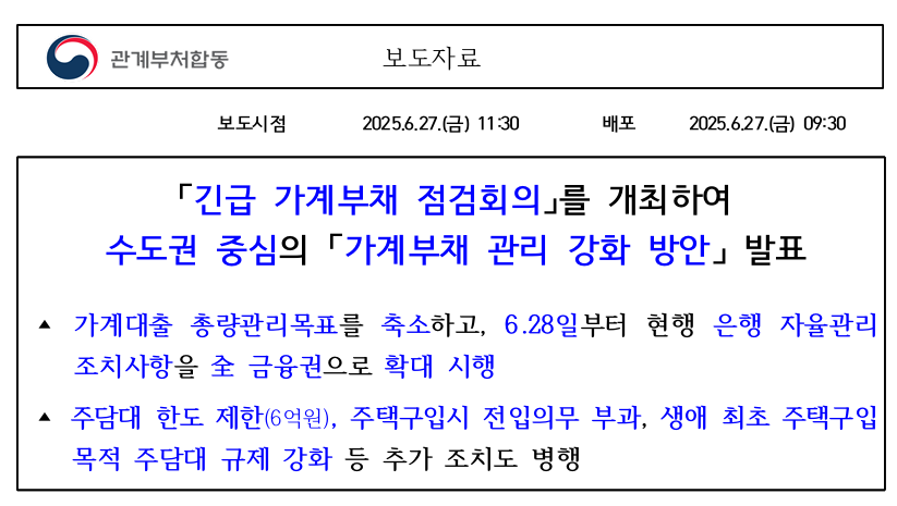 이번 대책은 수도권 중심의 부동산 투기 억제, 금융건전성 강화, 그리고 정책대출의 공공성 확보라는 세 가지 핵심 목표를 지니고 있으며, 2025년 6월 28일부터 순차적으로 시행됩니다.