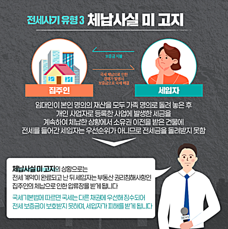 - 세입자가 실제 집주인인 것처럼 속여 또 다른 세입자와 이중 전세 계약을 맺음