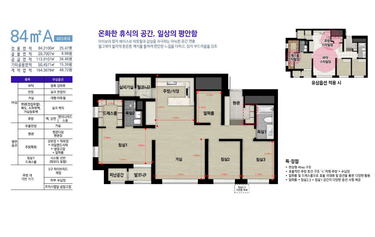 이 무상제공 옵션들은 쌍용건설이 자신있게, 평택역 쌍용 더 플래티넘 스카이 헤론 아파트 계약자에게만 제공하는 품목으로 그 가치성은 타 분양아파트 대비 약 3천만원의 가치성을 제공하여, 84㎡ 타입의 실거주 편의성과 고급스러움을 동시에 높이는 구성입니다. 주방·거실·욕실·수납 등 전 공간에 걸쳐 디자인·기능·수납 효율을 강화하여 입주 즉시 편리하게 사용할 수 있도록 기획되었습니다. 특히, 고급 마감재와 맞춤형 수납시스템, 최신 가전 제공은 초기 인테리어·가전 구매 부담을 줄이고, 장기적인 주거 만족도를 높이는 핵심 요소입니다.