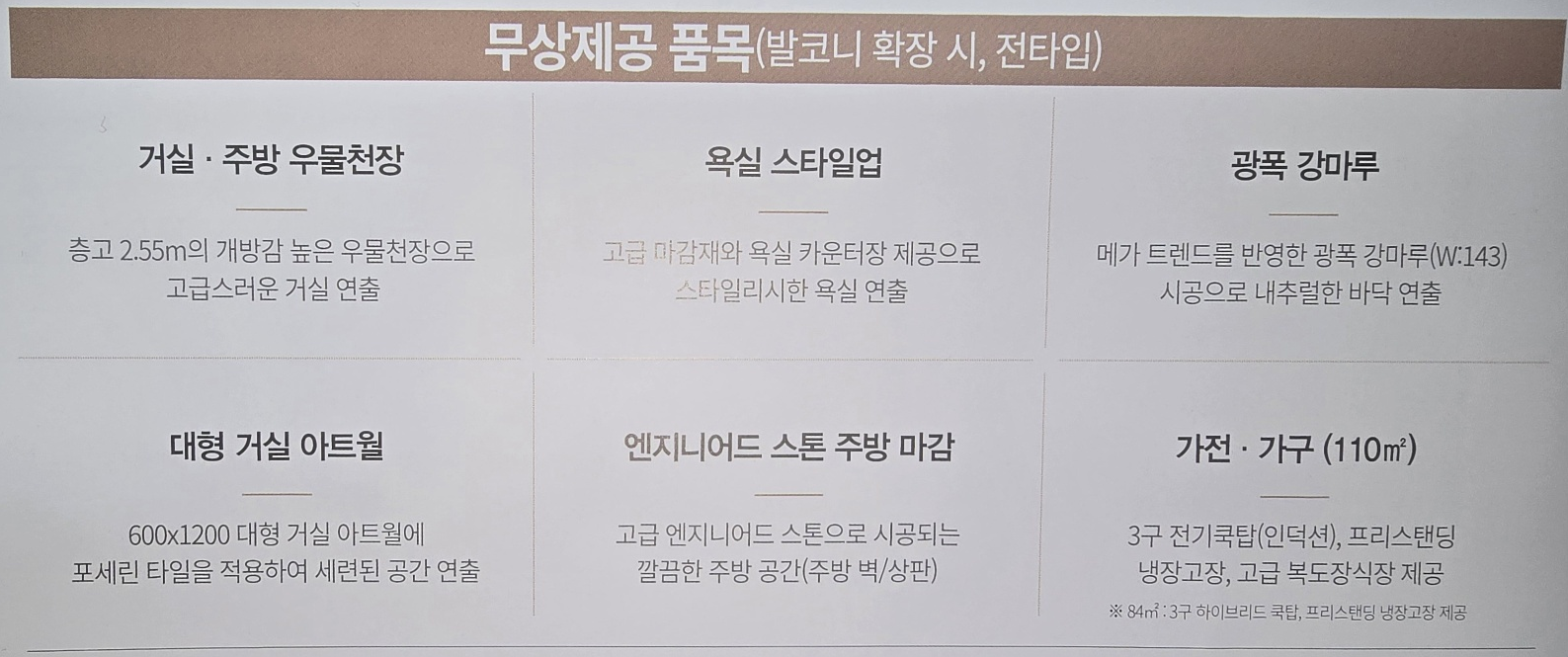 - 84㎡ (34평형): 약 5억 8천만원 ~ 약 6억 2천만원 (확장비/옵션가 별도)