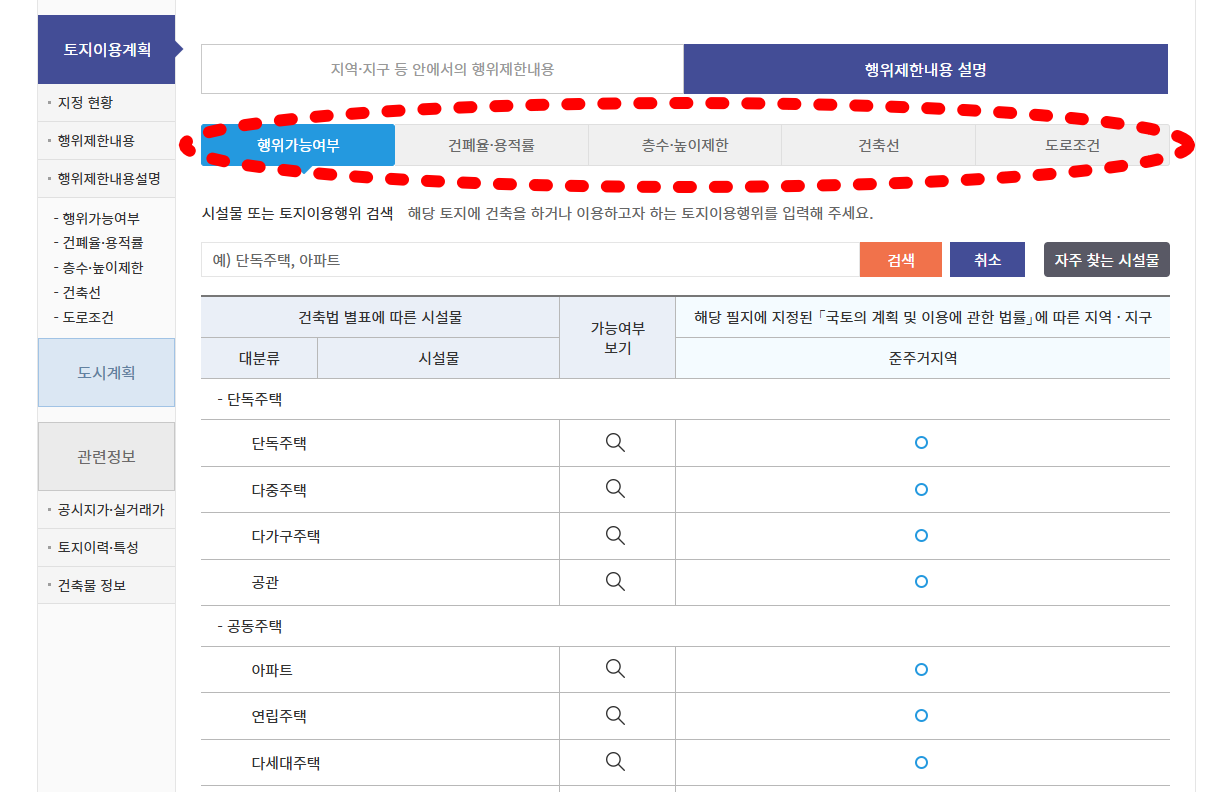▶️ 행위가능여부에서는 해당용도지역, 지구, 구역에 맞는 건축행위 가능, 제한적, 불가능에 대하여 상세히 정보를 제공합니다.