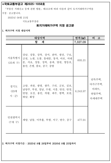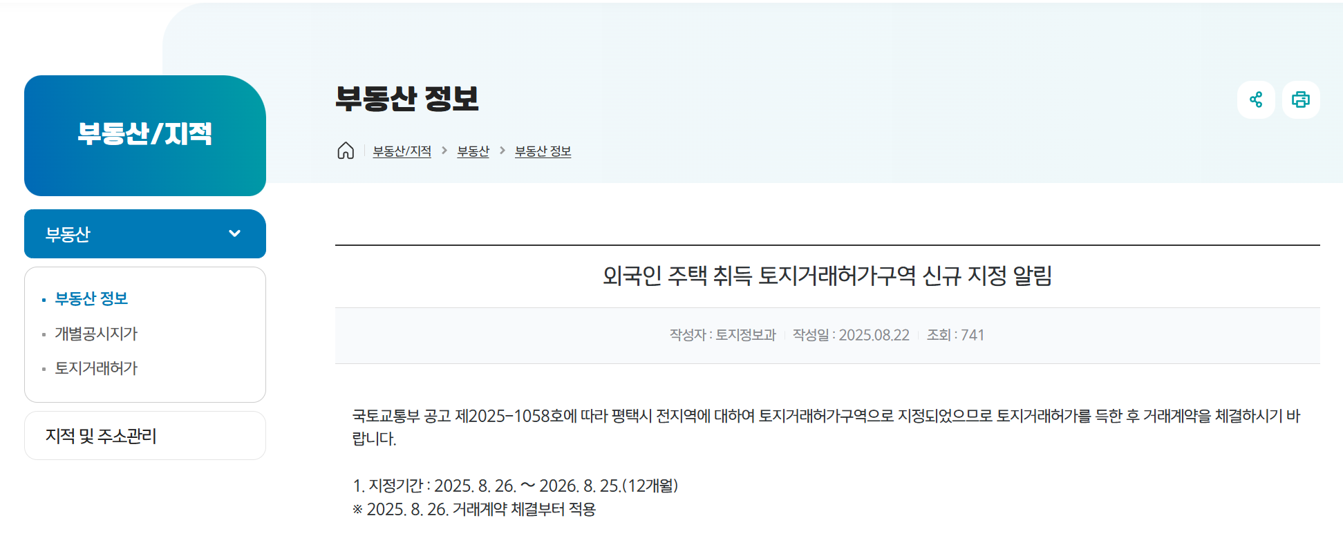 국토교통부 공고 제2025-1058호에 따라 평택시 등 전지역에 대하여 토지거래허가구역으로 지정되었음에 따른 상세 내용을 살펴보겠습니다.