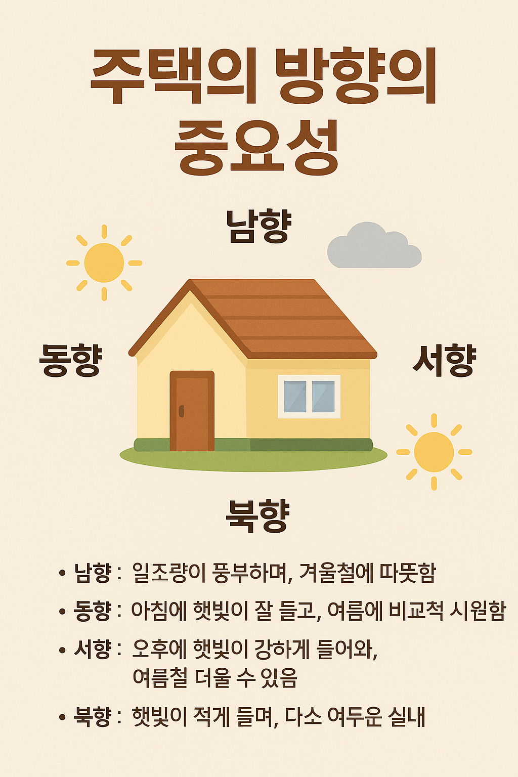 주택을 구매하거나 임대할 때 **‘방향’**은 단순한 선택이 아닌 쾌적한 생활환경을 결정짓는 중요한 요소입니다. 햇빛, 채광, 통풍, 냉난방 효율 등 거주 만족도를 좌우하는 핵심 변수이기 때문입니다. 이번 글에서는 주택의 방향이 중요한 이유와 동, 서, 남, 북 각각의 특성 및 생활에 미치는 영향에 대해 상세히 살펴보겠습니다.